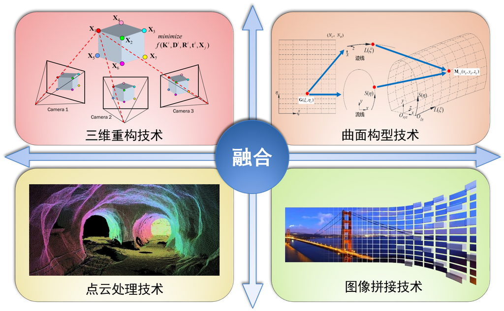 3DZI技术主要指将结构物三维实景模型(3D Reconstruction Model)和可深度缩放的结构物表观全景影像(Deep Zoom Image)运用于结构检查检测的技术方法,融合了三维重构技术、曲面构型技术、点云处理技术和图像矫正拼接技术。该技术主要可以用于结构物表观检查、检测以及结构物尺寸和净空的检查。表观检查、检测