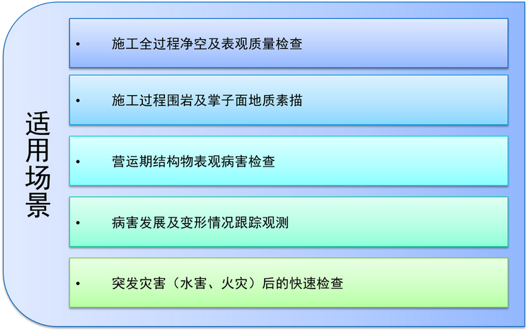 基于3DZI技术的检测方法适用于营运期结构物表观病害的检查,尤其适用于范围不大的专项检查,如突发灾害后的快速检查。施工期可使用该技术对外观尺寸、净空及表观质量进行检查,形成完整详细的施工过程档案,且易于追溯和还原现场。对于岩土体相关的施工过程,可以使用该技术记录地质情况,如隧道围岩地质素描及边坡地质调查。通过多期数据对比,该技术还可用于跟踪观测病害的发展及变形情况。